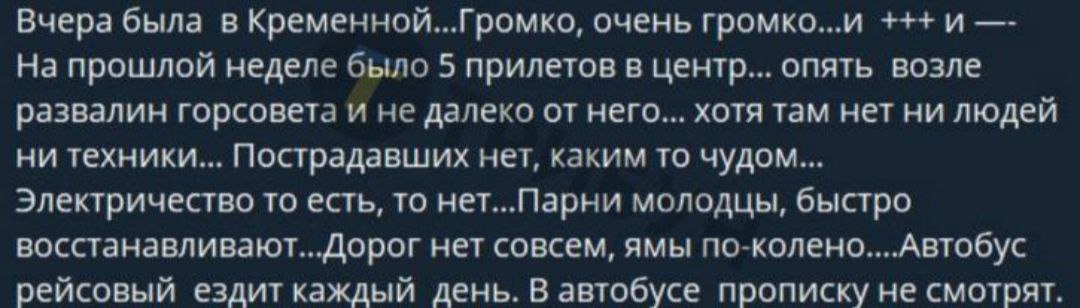 По словам жителей города в Кременной снова "громко" - прилеты в центре города. Наблюдаются перебои с электричеством, которое якобы ремонтируют. Состояние дорог ужасное, проще сказать, что их совсем нет.