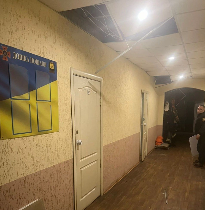 По данным спасателей, взрывной волной выбило окна и изуродовало внутреннюю отделку здания пожарно-спасательной части ГСЧС.