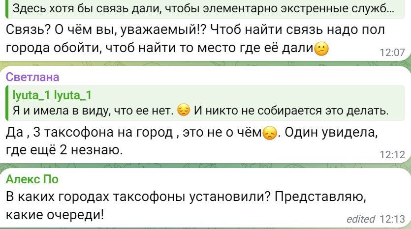 "Да, 3 таксофона на город‚ это не о чем. Один увидела, где еще 2 не знаю".