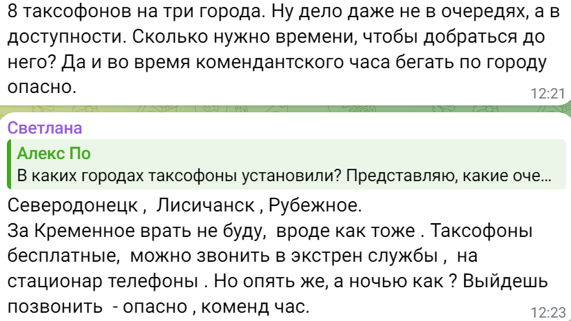 "8 таксофонов на три города. Сколько нужно времени, чтобы добраться до него? Да и во время комендантского часа бегать по городу опасно".