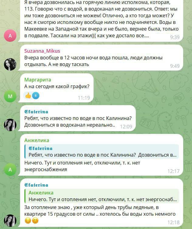 "Я вчера дозвонилась на горячую линию исполкома, которая, 113. Говорю что с водой, в водоканал не дозвониться. Ответ: мы им тоже дозвониться не можем! Отлично, а кто тогда может?... Воды в Макеевке так вчера и не было, вернее была, только в подвале", - пишут в сети.