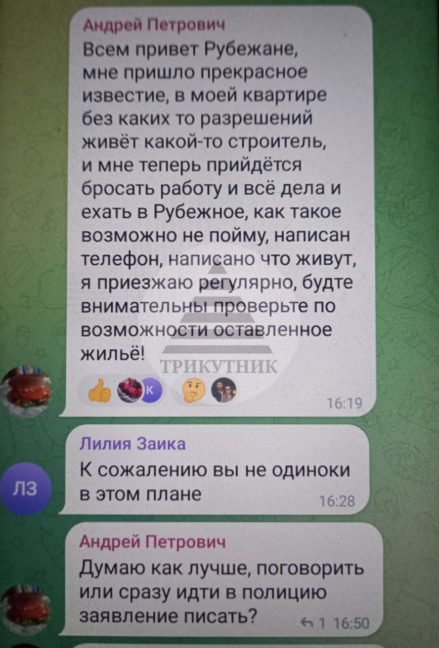 "Мне пришло прекрасное известие, в моей квартире без каких-то разрешений живет какой-то строитель, и мне теперь прийдется бросать работу и все дела, и ехать в Рубежное, как такое возможно, не пойму...", - пишет местный житель.