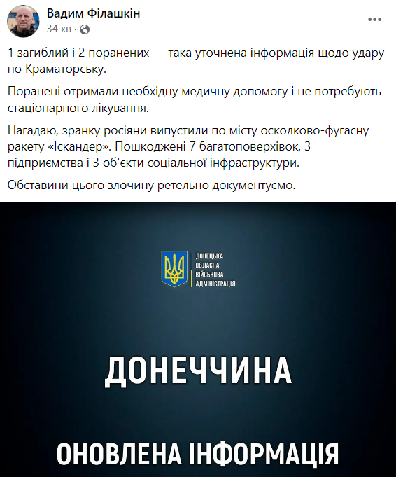 "1 погибший и 2 раненых - такова уточненная информация относительно удара по Краматорску", - говорится в сообщении.