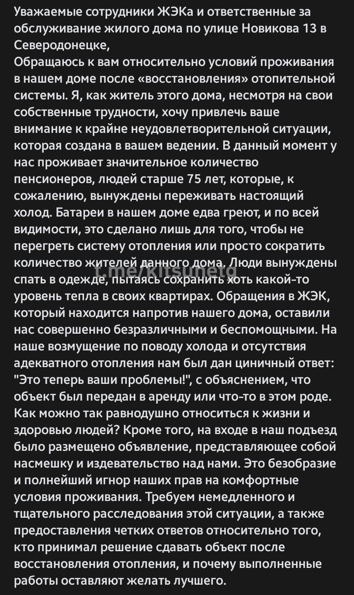 Один из жителей написал обращение к сотрудникам "ЖЭКа", подчеркивая, что батареи в доме едва греют, и это создает неприемлемые условия для проживания, особенно для пожилых людей. Люди вынуждены спать в одежде, сообщает Час Пик.