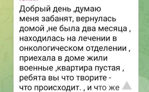 "Вернулась домой‚ не была два месяца, находилась на лечении в онкологическом отделении, приехала, а в доме жили военные. Квартира пустая, ребята, вы что творите, что происходит‚ и что же получается??? У меня просто нет слов.