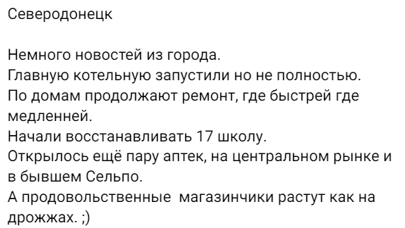 По сообщению местных жителей, оккупанты запустили главную котельную, но не полностью. Начали ремонтные работы в 17 школе. Также открылось несколько аптек в ТЦ "Астрон".