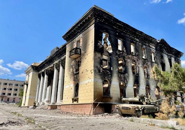 На фото центр внешкольной работы со школьниками и молодежью в Лисичанске. Оккупанты превратили здание в руины. Оно было разрушено и обгорело в результате российского "освобождения".