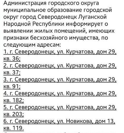 Во временно оккупированном Северодонецке Луганской области "освободители" вновь обнаружили "жилищные помещения с признаками бесхозяйного имущества". Список адресов прилагается.