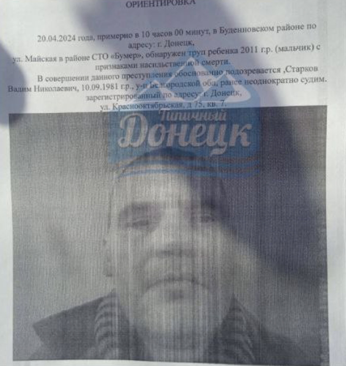 Также появилась ориентировка на предполагаемого преступника. Согласно ориентировке, в изнасиловании и убийстве ребенка подозревается уроженец Белгородской области РФ, который ранее был неоднократно судим. Сейчас гражданин РФ зарегистрирован на территории Донецка.