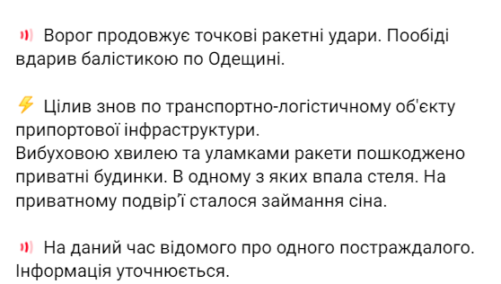 "Враг продолжает точечные ракетные удары. После обеда ударил баллистикой по Одесской области", - говорится в сообщении.