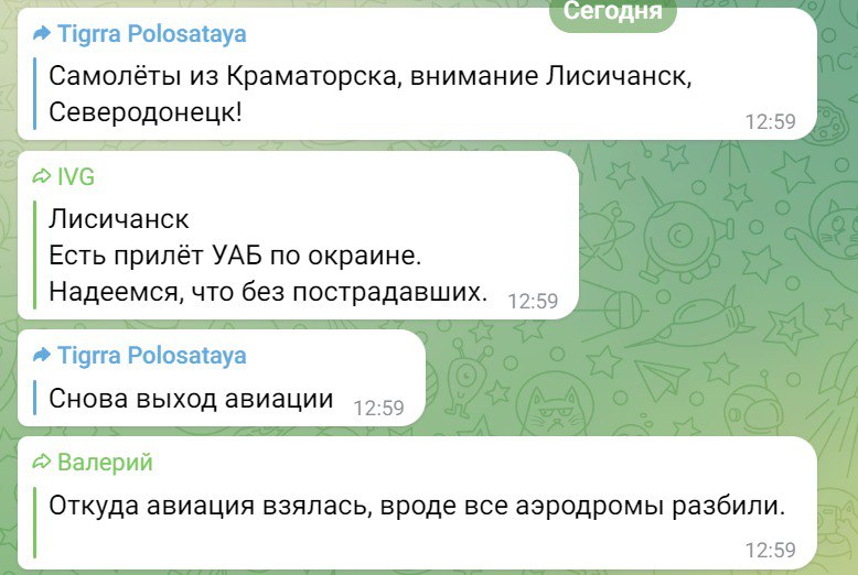 "Лисичанск. Есть прилет УАБ по окраине. Надеемся, что без пострадавших".