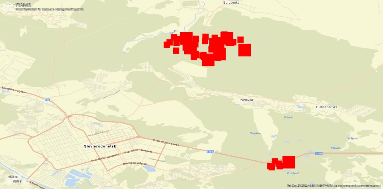"Сегодня спутник НАСА зафиксировал мощный пожар между Боровеньками и Пурдовкой. Второй день продолжается пожар возле часовни на выезде из Северодонецка в направлении Новоайдара по трассе Т-13-06", - говорится в сообщении.
