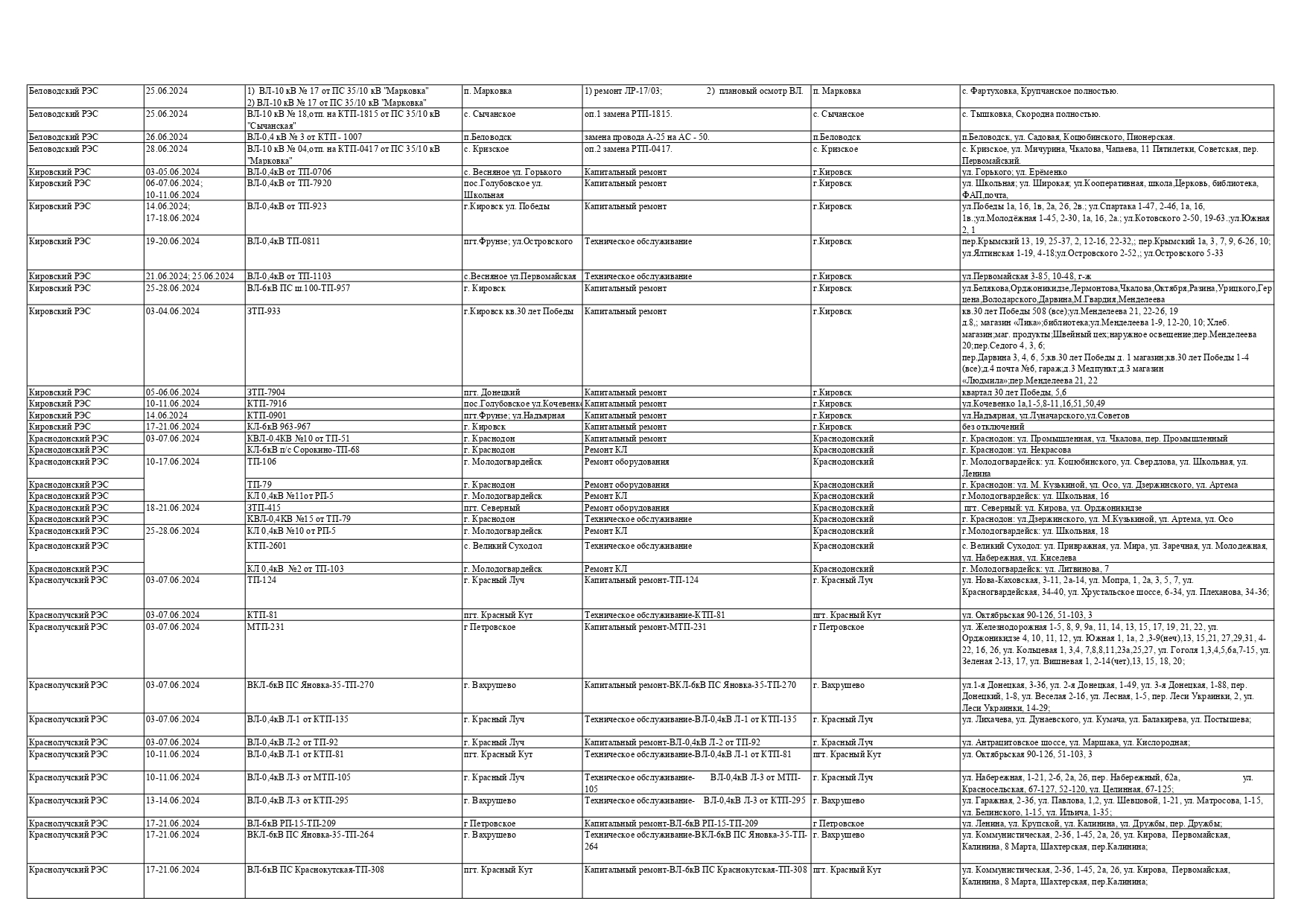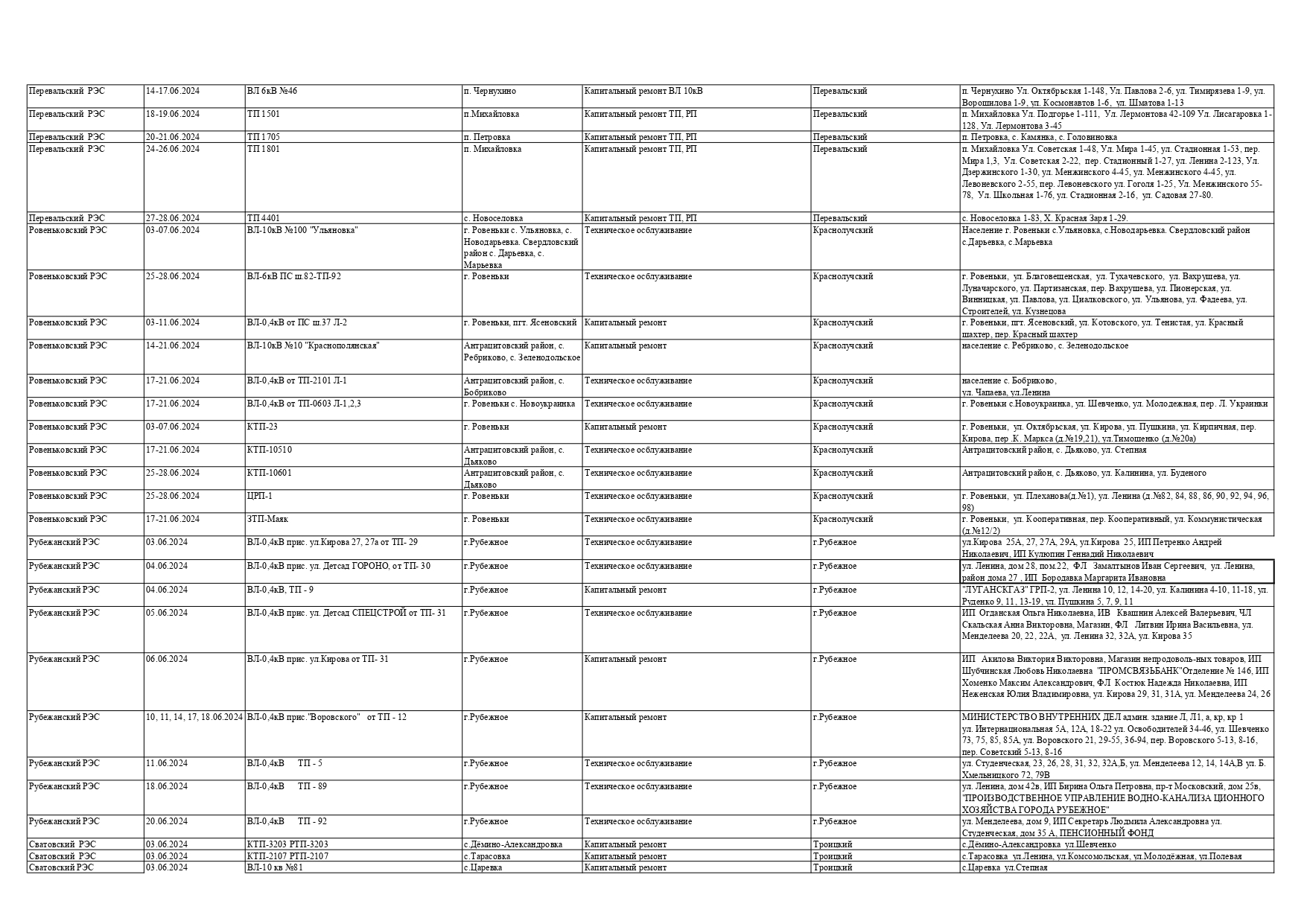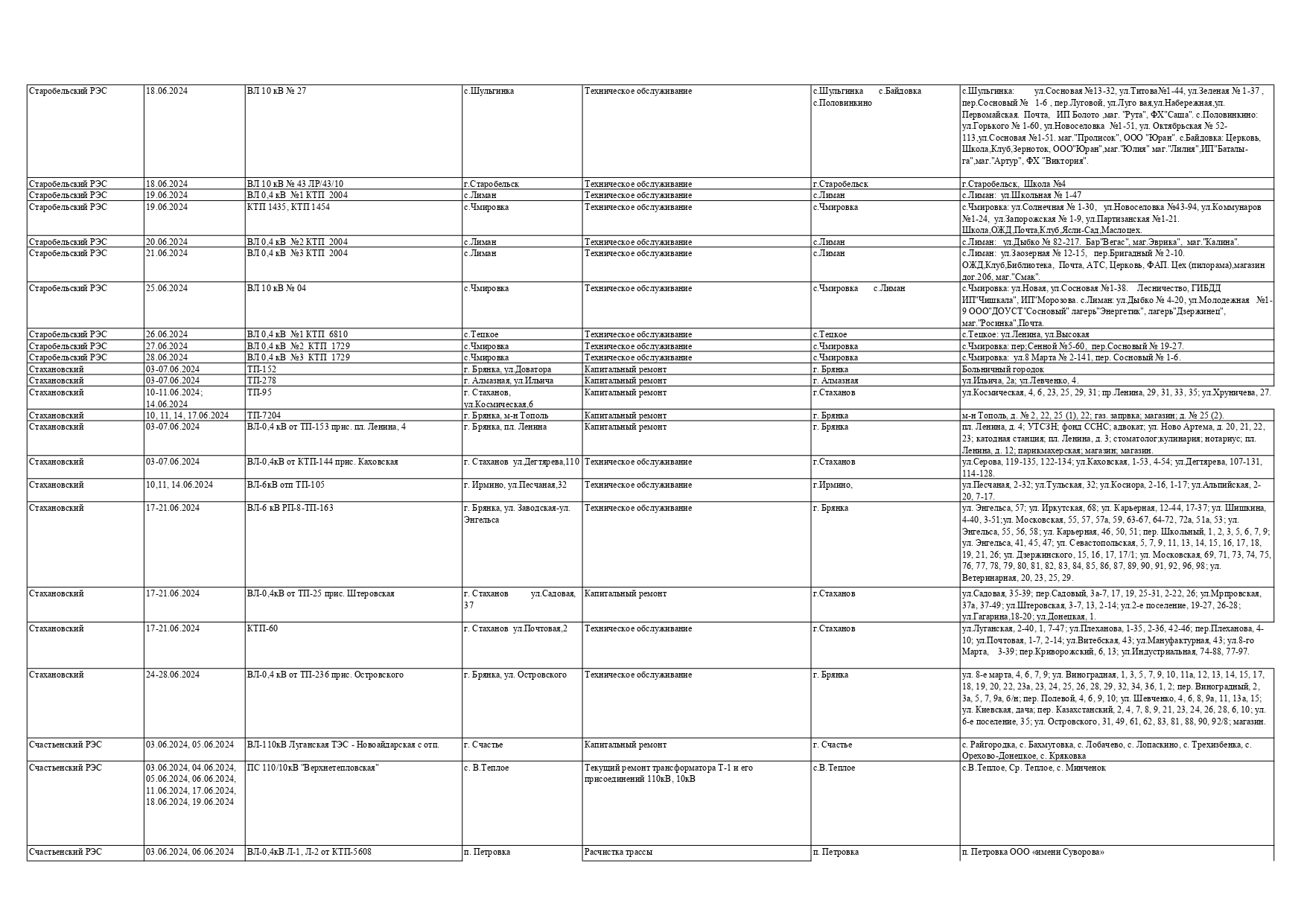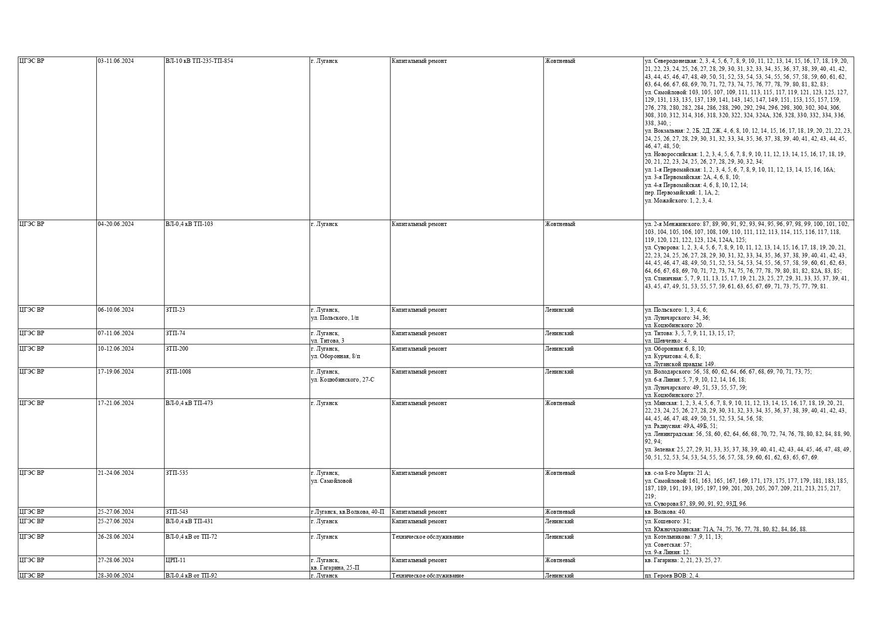 Оккупационная "администрация" области опубликовала на пропагандистский пабликах график запланированных отключений электроснабжения в июне для некоторых районов Луганска и "муниципальных округов ЛНР" из-за ремонтных работ на электрооборудовании, передает Час Пик.