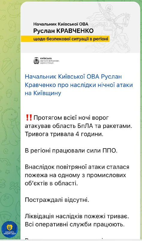 По сообщению главы Киевской областной военной администрации (ОВА) Руслана Кравченко, противник использовал беспилотные летательные аппараты (БпЛА) и ракеты для нападения на регион, передает Час Пик.