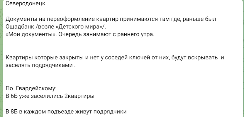 Несмотря на обещания восстановить разрушенное жилье, по сообщению ОВА, реальные действия оккупантов ограничиваются показательной деятельностью. В многоэтажках, которые пострадали лишь незначительно, проводятся ремонты, но подрядчики, приезжающие из России, занимают пустые квартиры в каждом подъезде. Эти временные жильцы, завершив работы, не остаются в квартирах, а забирают с собой все, что им понравилось, перед тем как отправиться на следующий объект.