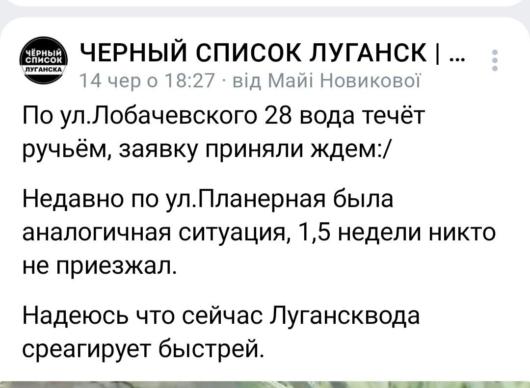 "Хотите знать, куда уходят ваши деньги за воду? Приезжайте в Малую Вергунку и вы увидите, что деньги утекают вместе с водой прямо в канаву, а потом в речку. Была подана заявка в «Луганскводу», приехала аварийная служба, разрыли яму, сделали видимость работы и все… ждите. А чего ждать, у людей маленькие дети, в домах пенсионеры, больные люди, а воды не набраться, уже не говорю о том, чтобы бойлер заполнить и постирать. И это в такую жару...".
