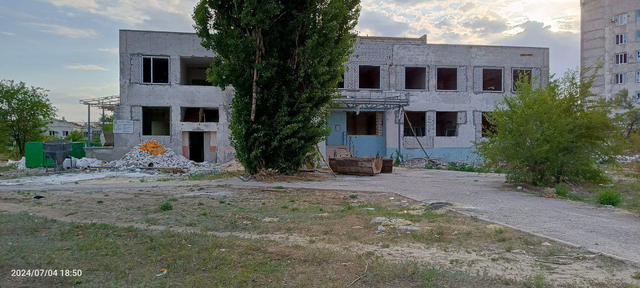 Второе фото изображает недостроенное или разрушенное здание, которое, вероятно, было общественным или административным объектом. На фото видны остатки строительных материалов, мусор и разрушенные конструкции. Деревья вокруг здания добавляют контраста между природой и руинами.