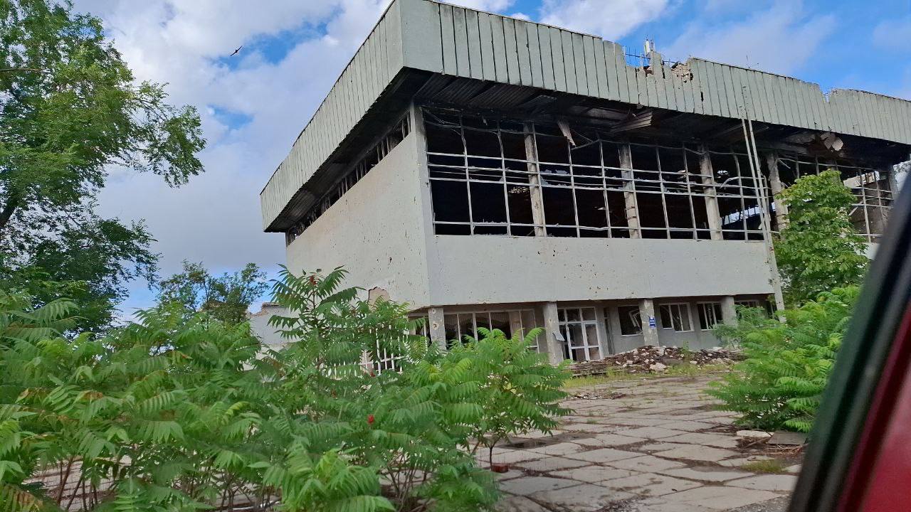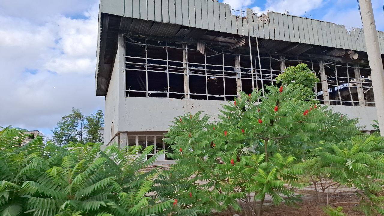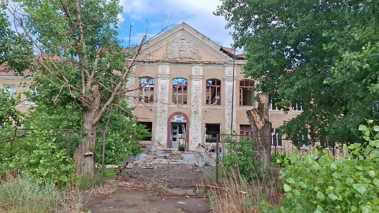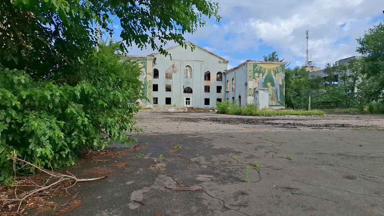Окна полностью разбиты, конструкции выглядят поврежденными. Здания, вероятно, когда-то служили административными или образовательными учреждениями, однако сейчас они стоят заброшенные и разрушенные.