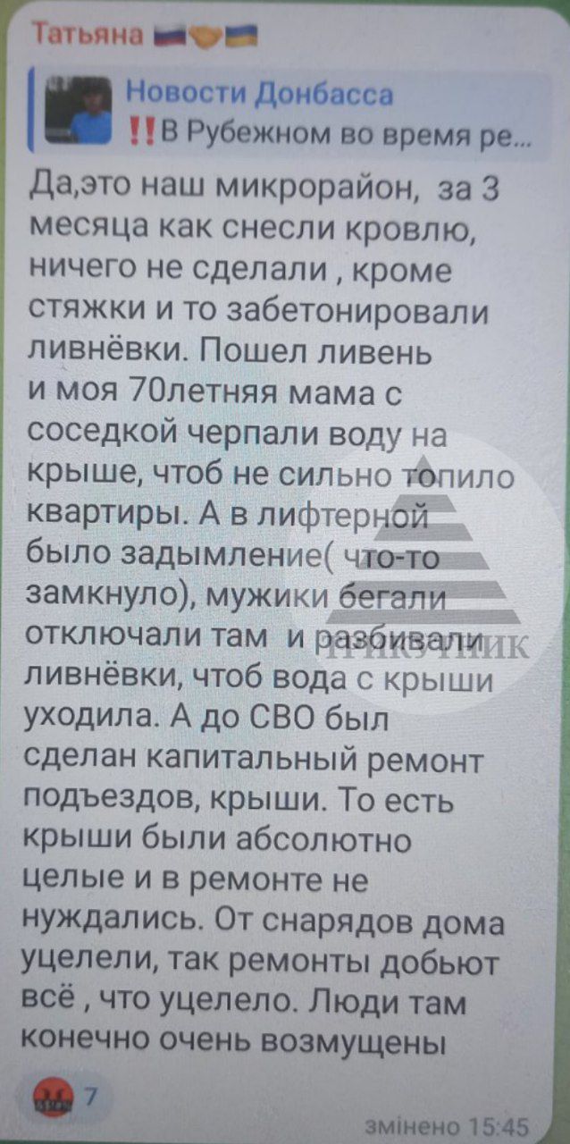 Эти сообщения отражают общее настроение и разочарование жителей Рубежного. Люди видят, как их город разрушается не только от боевых действий, но и от некачественных и неуместных ремонтов, проводимых оккупантами.