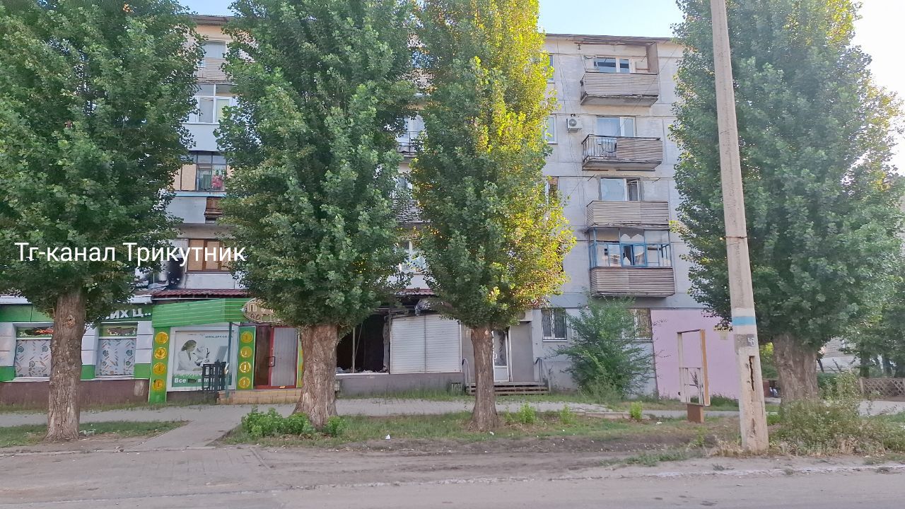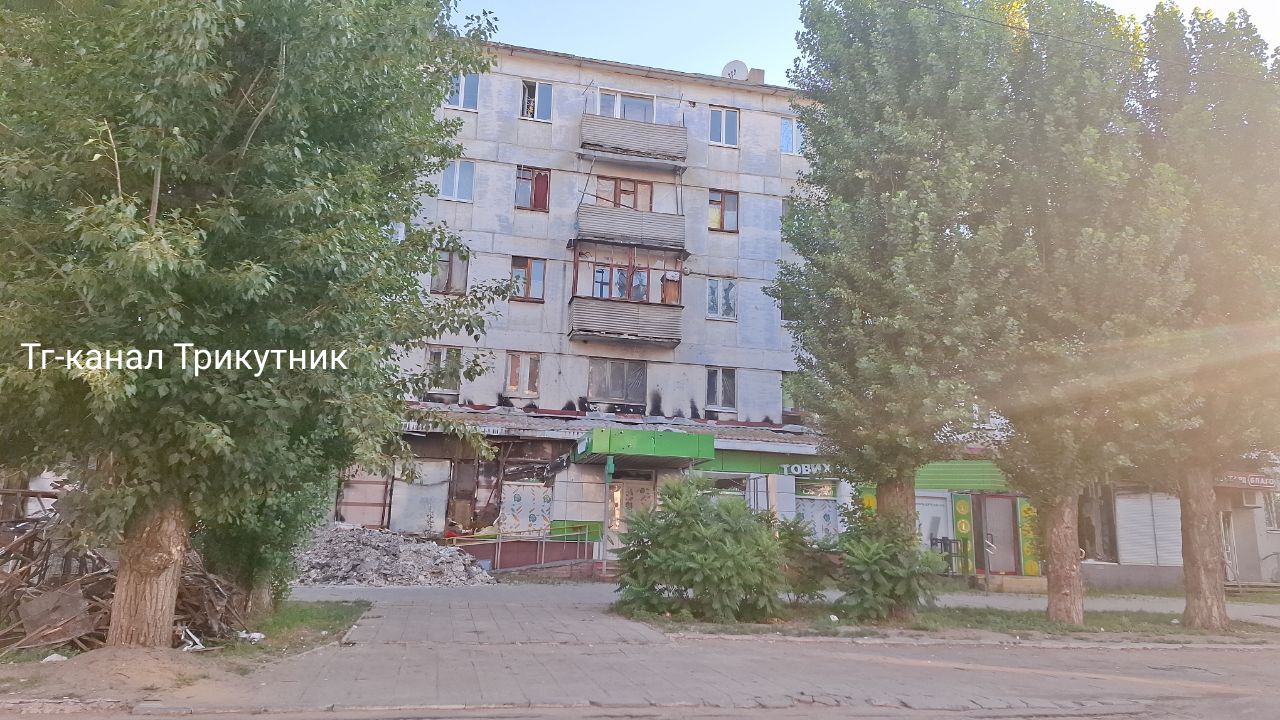 На фото перекресток с заброшенными домами и пустыми улицами. На фоне виднеются здания, имеющие значительные повреждения. Некоторые из них частично разрушены, окна выбиты, фасады покрыты трещинами и следами от обстрелов. Дорога поросла бурьяном, что свидетельствует о том, что здесь давно не было движения транспорта. Деревья на улицах остаются неухоженными, некоторые из них частично сломаны или сухие. Окна некоторых квартир забиты досками, другие же остались разбитыми. Под домом видны остатки магазина, вывеска которого «Кафе Приват» до сих пор сохранилась. Вокруг здания растут дикие кусты, что свидетельствует об отсутствии ухода за территорией.