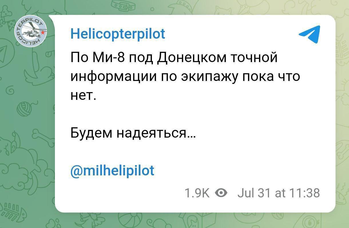 Согласно сообщению ТГ-каналу "Helicipterpilot", связанного с российской военной авиацией, информация о состоянии экипажа на данный момент отсутствует, передает Час Пик.