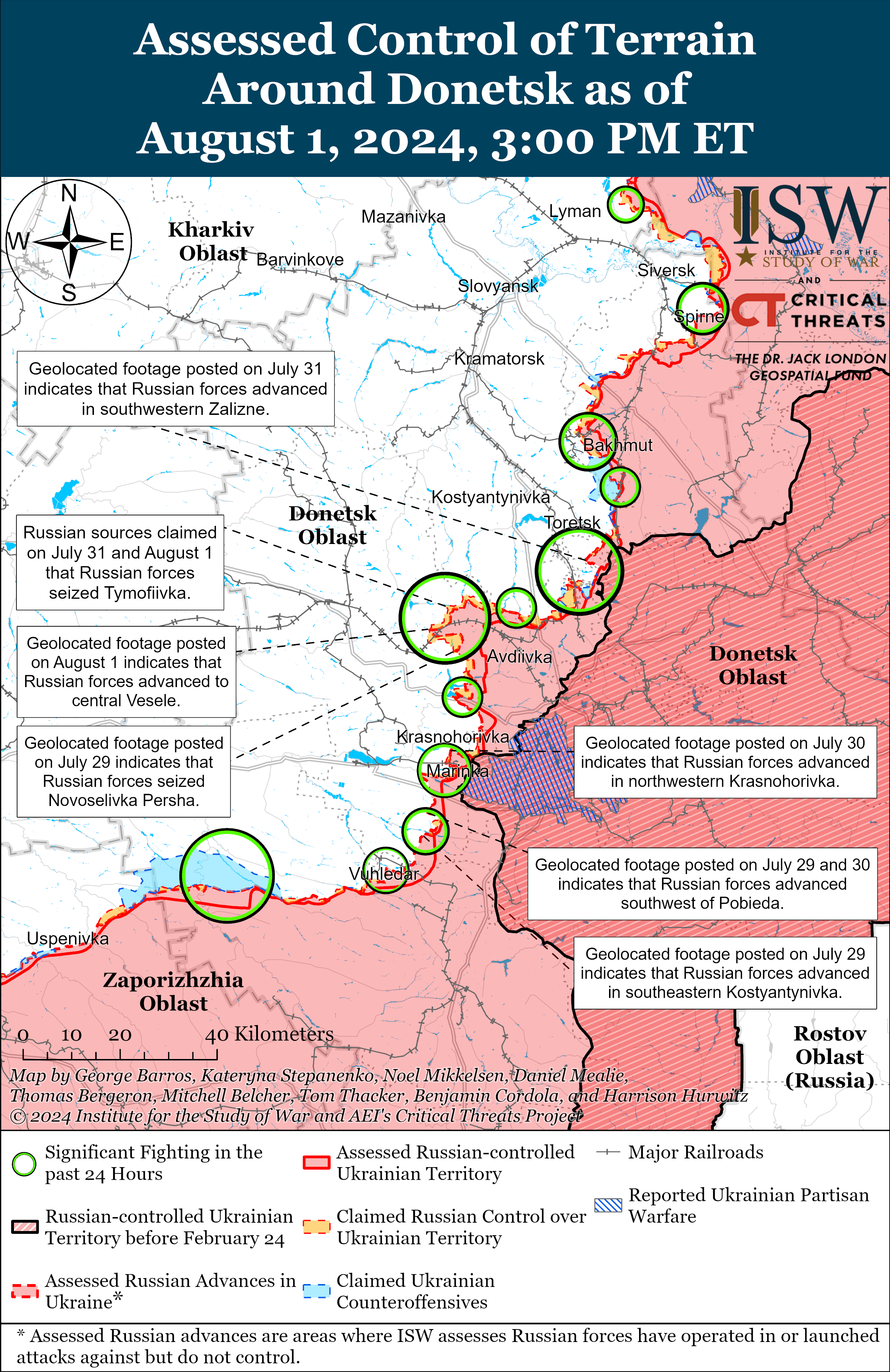 Геолокационные кадры, опубликованные 1 августа, демонстрируют, что российские войска продвинулись в пределах Веселого в направлении трассы Т0511. Самое отдаленное подтвержденное продвижение зафиксировано примерно в 3,5 километрах от окраин поселка Гродовка.