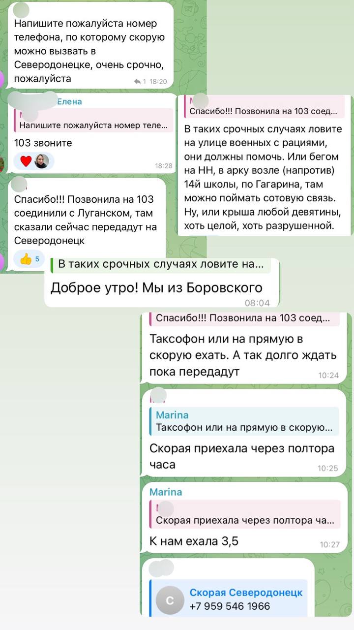 Местные жители делятся своими историями и предлагают друг другу советы по вызову скорой помощи. Один из горожан просит номер телефона, по которому можно связаться с медиками, на что ему отвечают: "Звоните на 103 на улице у военных с рациями, они должны помочь. Или бегом на НН, в арку возле 14-й школы, по Гагарина, там можно поймать сотовую связь. Ну, или крыша любой девятиэтажки, хоть целой, хоть разрушенной".