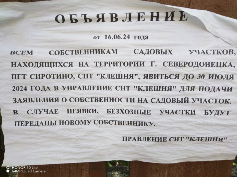 На фото из города фигурирует "объявление" о необходимости собственникам садовых участков Северодонецка, Сиротино, "Клешни" явиться с подтверждением права собственности.