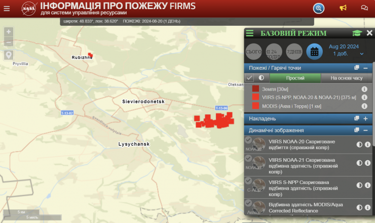 Как сообщает "Северодонецк Times" со ссылкой на спутниковые данные NASA, в районе северодонецкого городского кладбища бушует крупный лесной пожар. Спутниковые снимки показывают, что огонь стремительно приближается к поселку Метелкино, что вызывает дополнительную озабоченность у местных жителей и экспертов.