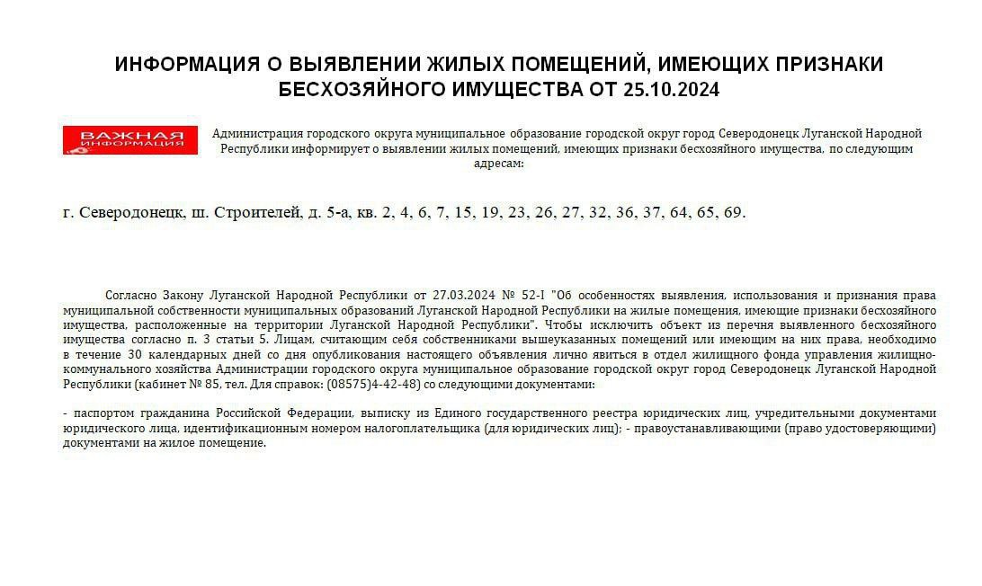 В оккупированном Северскодонецке опубликован список из 15 квартир, которые по состоянию на 25 октября могут быть признаны "бесхозными" и переданы в муниципальную собственность, если их владельцы не явятся для подтверждения прав на имущество.