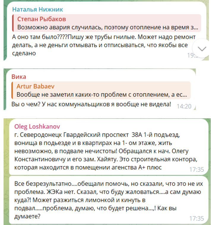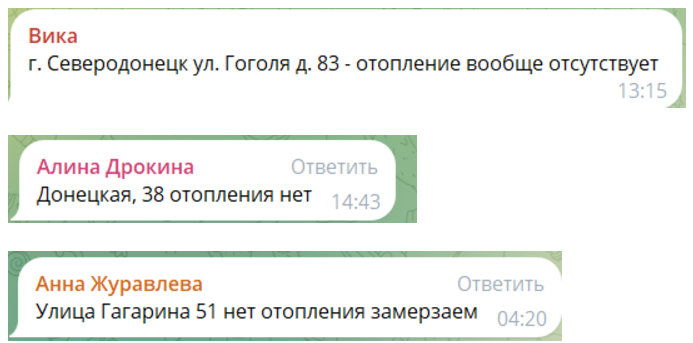 Один из пользователей пишет: "Гоголя, 83 – отопление вообще отсутствует", а другие добавляют, что ситуация аналогична в домах по адресам Донецкая, 38 и Гагарина, 51. По словам жителей города в их квартирах мороз, и они вынуждены замерзать, не получая необходимой помощи.