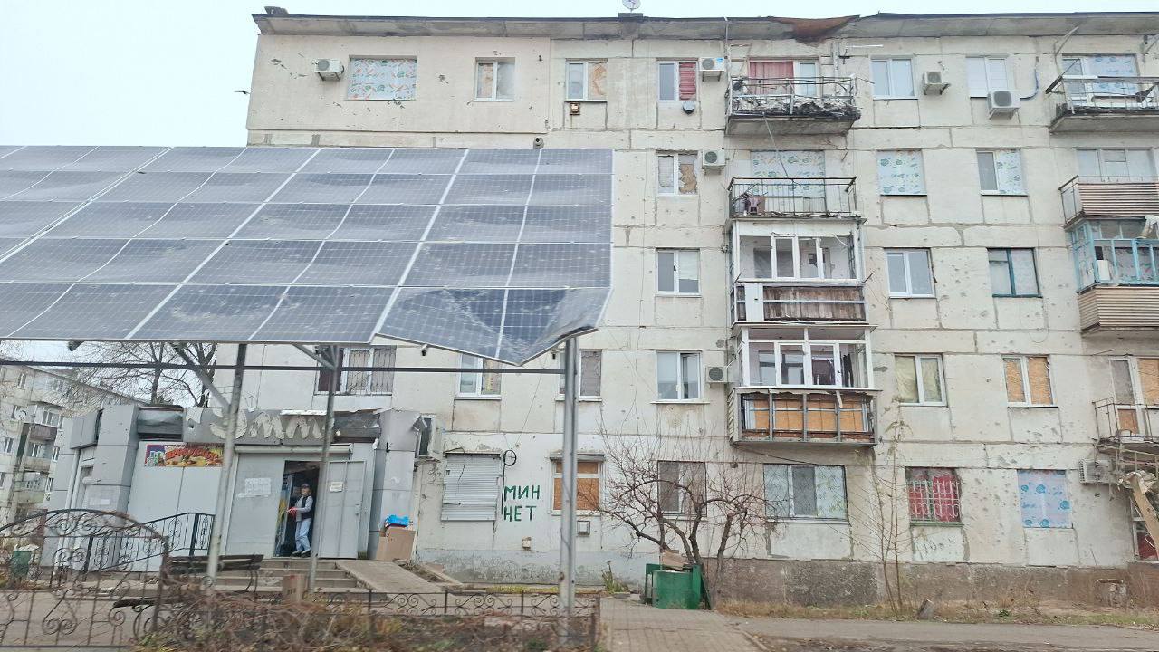 В одном из домов на четвертом этаже, например, до сих пор "висит" балконная рама, а в стенах остались большие дыры, что свидетельствует о крайне низком уровне восстановления жилых помещений. На окнах - временные решетки USB, а состояние самого здания вызывает вопросы о безопасности и пригодности для проживания.