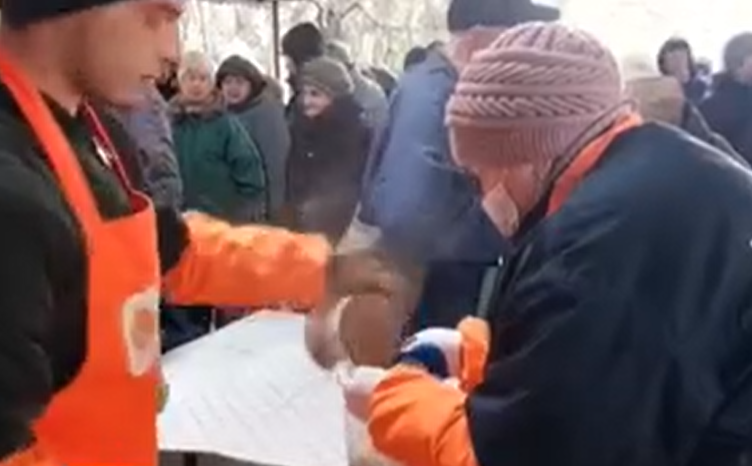 Пища, которую привезли "волонтеры", удивляет: суп раздают прямо в полиэтиленовые пакеты. Несмотря на такую ситуацию, люди не теряют надежду, и готовы ждать в очереди. На видео голос за кадром уточняет, что еда была полностью разобрана в течение 40 минут, а 1500 порций горячего питания и столько же булочек исчезли буквально за считанные минуты.