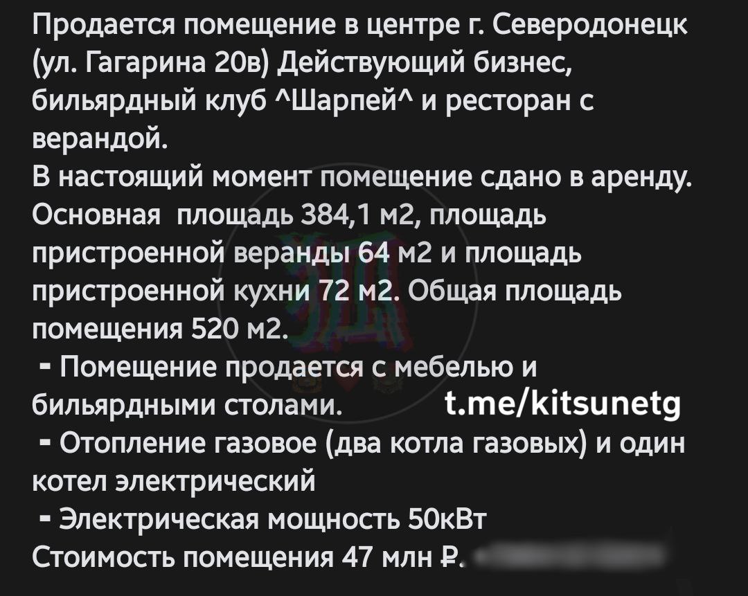 В оккупированном Северодонецке появилось объявление о продаже одного из самых известных заведений города – ресторан "Шарпей", расположенного в самом центре города на улице Гагарина, 20в.
