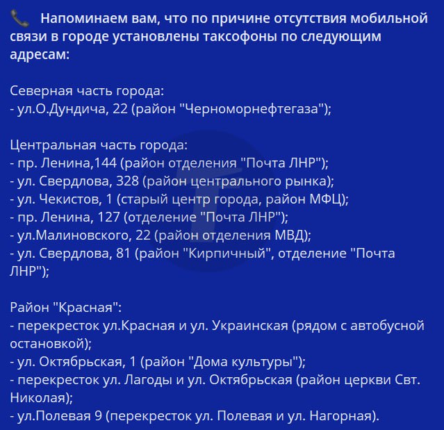 Оккупационная "администрация" Лисичанская недавно опубликовала перечень таксофонов в городе, которых оказалось 11 штук.