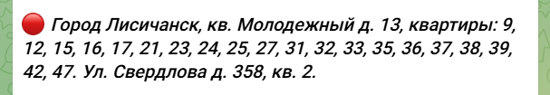В опубликованном списке значатся адреса в Лисичанске, включая квартиры на кв. Молодежный и улице В. Сосюры (бывшая Свердлова). Также указано, что для подтверждения прав на жилье собственники должны предоставить паспорт гражданина РФ или другой удостоверяющий личность документ, а также правоустанавливающие документы на помещение.