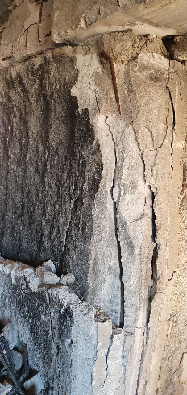 Снимки, датированные февралем 2025 года, демонстрируют помещение с голыми кирпичными и бетонными стенами, поврежденной штукатуркой и следами значительного износа. На них можно заметить разрушенные конструктивные элементы, а также серьезные повреждения несущих плит.