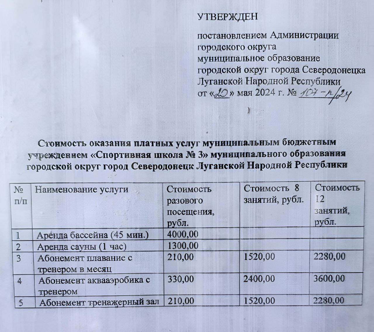Также в сети появились расценки на услуги спортивной школы №3 в Северодонецке: