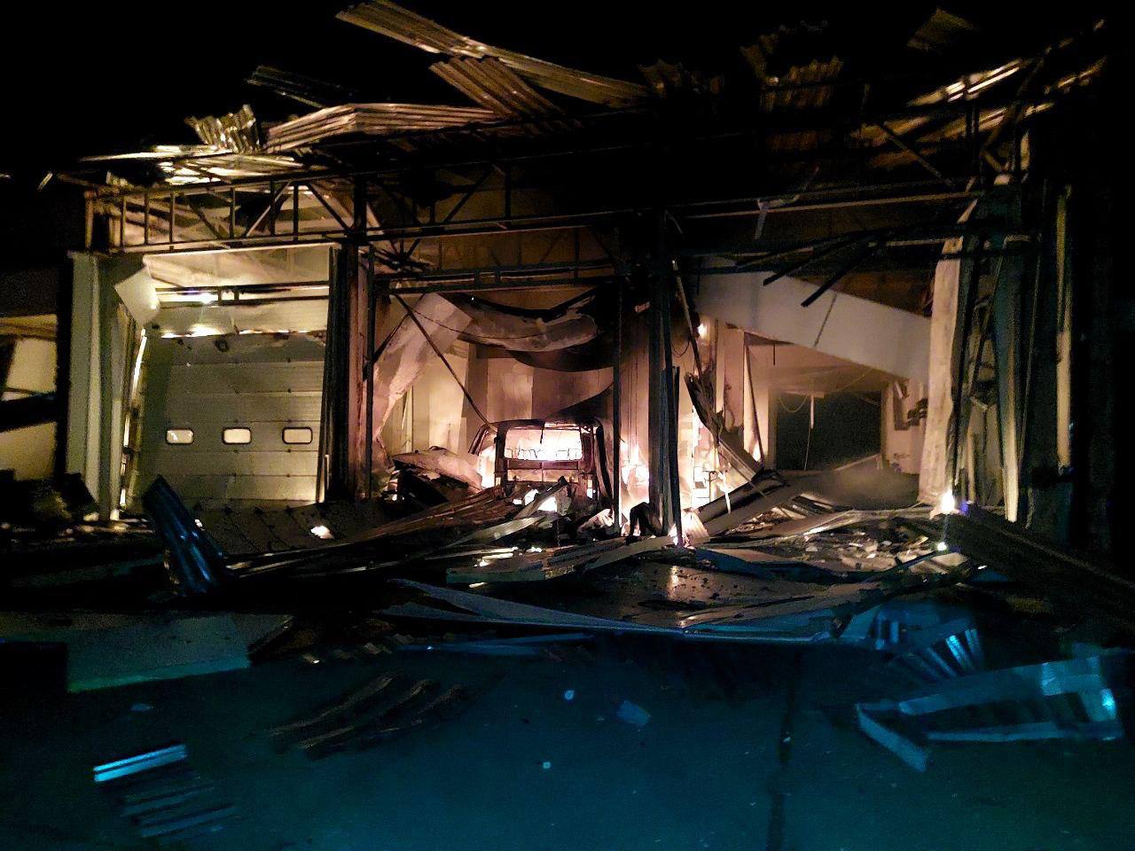 "1:40 8 марта Богодуховский р-н, г. Богодухов. В результате попадания четырех БпЛА (типа "Шахед") на территории мясокомбината возник пожар и повреждены производственные цеха, гаражи", - написал Синегубов.