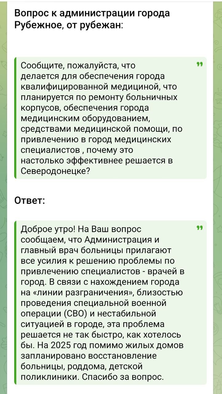 "Сообщите, пожалуйста, что делается для обеспечения города квалифицированной медициной, которая планируется по ремонту больничных корпусов, обеспечения города медицинским оборудованием, средствами медицинской помощи, привлечения в город медицинских специалистов, почему это эффективнее решается в Северодонецке (Северодонецке)?"