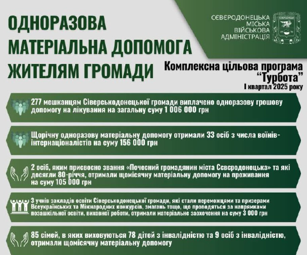 С начала 2025 года 277 жителей Северодонецкой городской территориальной общины получили единовременную денежную помощь на лечение. Общая сумма выплат составила 1 006 000 гривен.