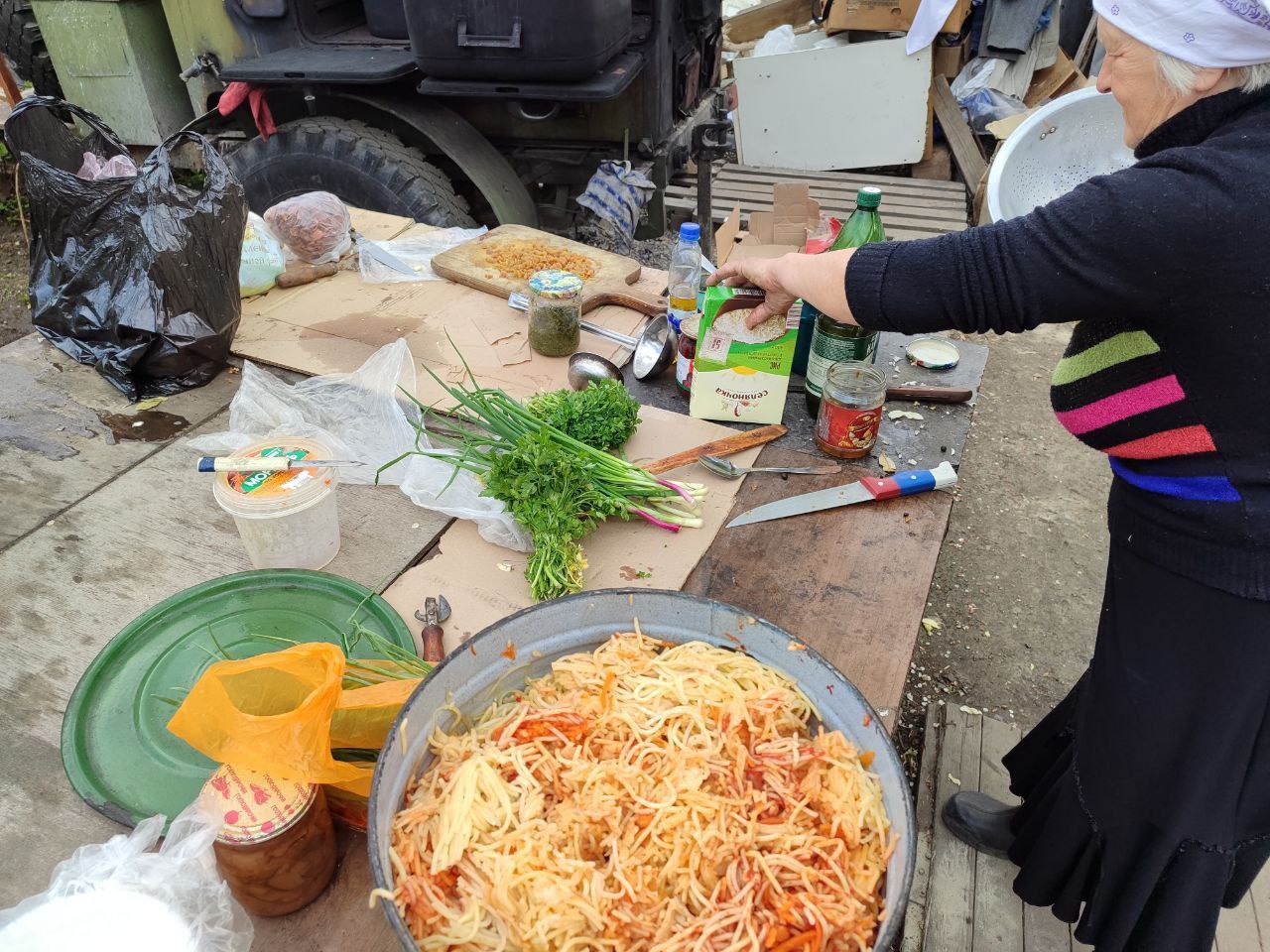 Очереди выстроятся каждый раз. Люди часами ждут под открытым небом — несмотря на дождь, снег или холод. В этот раз волонтеры привезли гречневую кашу, куски хлеба и салат из капусты. Иду люди получают в "пакетиках".Это элементарная потребность, которую оккупационные власти системно игнорируют.