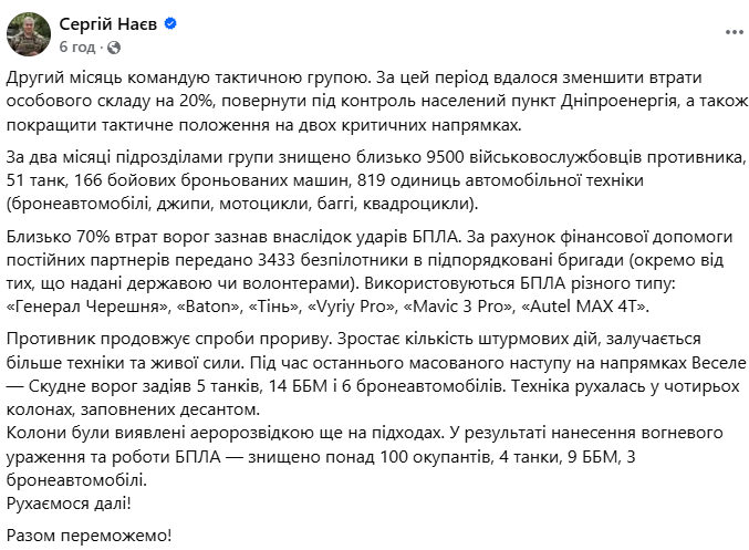 "За два месяца нам удалось улучшить тактическое положение на двух критических направлениях и вернуть под контроль населенный пункт Днепроэнергия", - подчеркнул Наев.