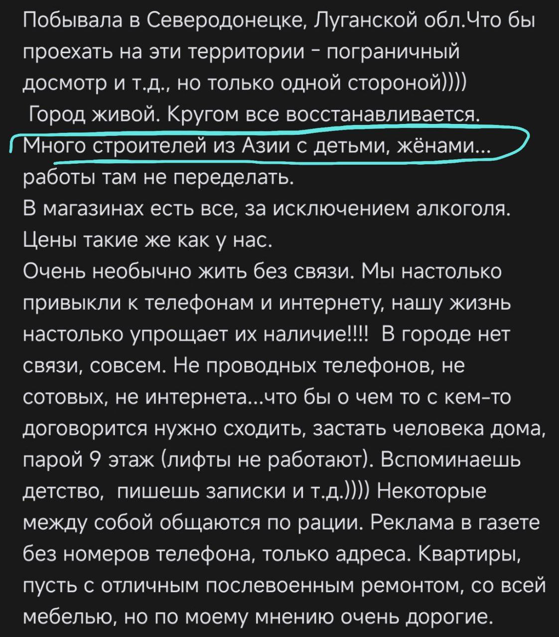 Больше всего ее поразило полное отсутствие связи: ни мобильных операторов, ни проводного интернета, ни даже стационарных телефонов. Чтобы договориться о встрече или решить какие-то вопросы, приходится лично идти к человеку домой — иногда подниматься на девятый этаж пешком, ведь лифты не работают. В комментариях она сравнила эту реальность с "возвращением в детство", где люди вынуждены писать записки или искать способы связи из-за рации.