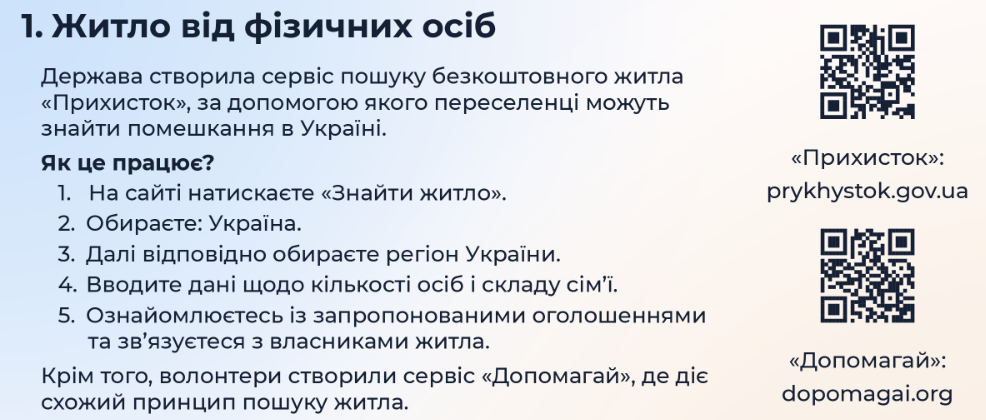 Найти бесплатное жилье можно на платформе “Прихисток”. Достаточно просто выбрать регион, указать информацию о составе семьи, ознакомиться с предложениями и связаться с собственниками жилья. Кроме того, существует созданный волонтерами сервис “Допомагай”, который действует по аналогичному принципу.