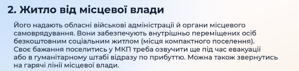 Жилье для переселенцев предоставляют областные военные администрации и органы местного самоуправления. В частности, ВПЛ могут быть размещены в местах компактного проживания. Заявить о желании поселиться в месте компактного проживания в том или ином регионе можно во время эвакуации, в гуманитарных штабах или позвонив на горячие линии местной власти.