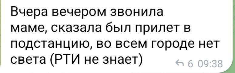 "Вчера вечером звонила маме, она сказала, что был прилет в подстанцию, во всем городе нет света. (РТИ не знает)".