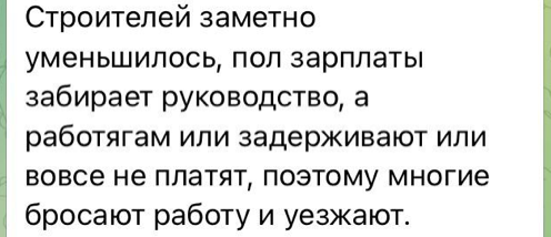 Как сообщают очевидцы, так называемые строители уезжают из города. Причина - невыплата или задержки зарплат. Работники жалуются на то, что половину зарплат забирает руководство. На таких условиях работать никто не хочет.