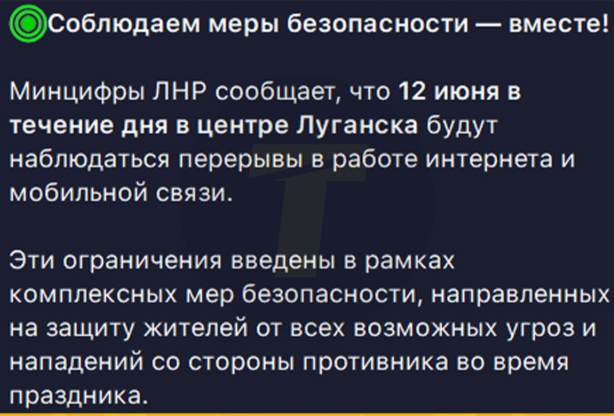 Информацию распространило так называемое "Министерство цифрового развития ЛНР". При этом никаких конкретных угроз или технических объяснений, кроме общей формулировки о «мерах безопасности», не приводится.