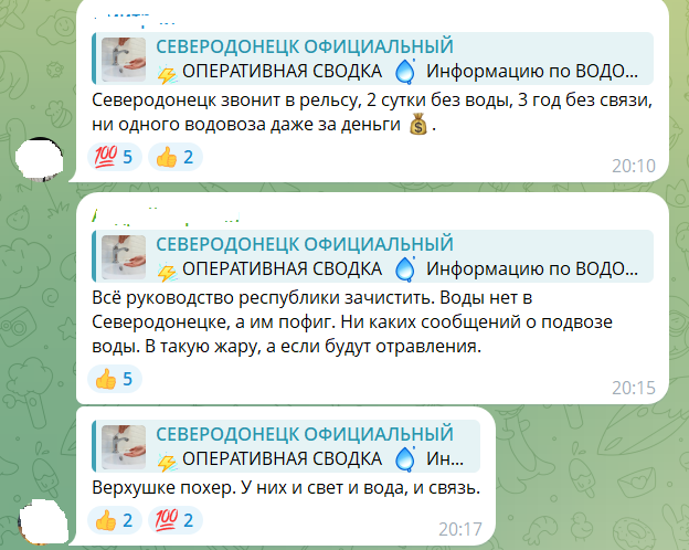 "Северодонецк звонит в рельсу. 2 сутки без воды, 3 год без связи, ни одного водовоза даже за деньги", - написал местный житель в сети.